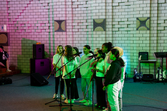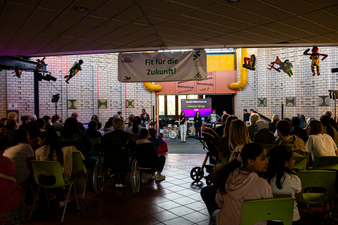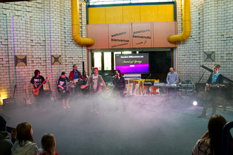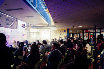 Die Schule hat 2 Bands unter der Leitung von Dietmar Kempf und Dirk Engler. Einer der Top-Performer und der Frontmann der Band, der immer Stimmung und Motivation in das Publikum bringt, ist Fabian Schilling (8b). Er schreibt auch regelmäßig mit Dietmar Kempf eigene Songs für die Schulband. Aber auch die Sängerin Emily Geib (9b) beeindruckte das Publikum mit ihren Auftritten. An diesem Abend begeisterten die Musiker*innen Noah Steinmann, Jason Spengler, Lars Buschlinger und Till Ruffing unter der Leitung von Dirk Engler mit dem Opener „Love me again“ und „Let´s do it together“ und „Es ist nie zu spät“.
