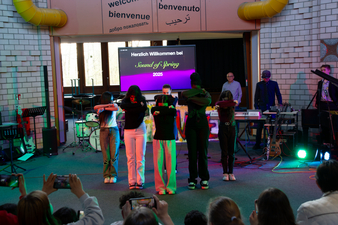 Das Lied „Ich bin ein Kind“ a capella gesungen von einer Gruppe von 5ern unter der Leitung von Kirsten Brandt, erinnerte in 7 verschiednen Muttersprachen unserer Schüler*innen, dass wir alle im Herzen Kinder dieser Erde sind. Die Darbietung „Flagge zeigen“ von Fabian Schilling und seinem selbst geschriebenen Rap gegen Rassismus und für Courage und Menschlichkeit, bei dem Schüler*innen der Schulgemeinschaft einzelne Flaggen ihrer Herkunftsländer zu einer großen Flagge der Gemeinschaft zusammenlegten, vermittelte eben jenen Aspekt, dass wir eine bunte Schulgemeinschaft sind, in der jede/r willkommen ist.